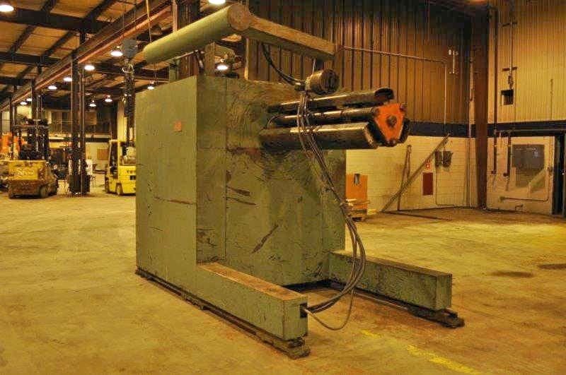 -Uncoiler: 23,000# Capacity Model RM60-24 S/N: SRB85-M0055 62" Face Mandrel 20" - 24" Coil I.D. Range Hydraulic Wedge Type Expansion Hyd. Threading Drive Air Cylinder Operated Disc Brake Powered Holddown Arm Overall Size: 146" L x 77" W x 105" High
