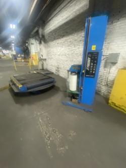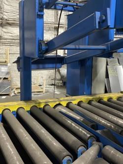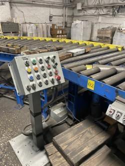 The table consists of a conveyor top mounted on a large diameter bearing. The table accepts skids as they are pushed off of the turntable. The operator straps on side of the skid, rotates the table, straps the other side and discharges the skid.
