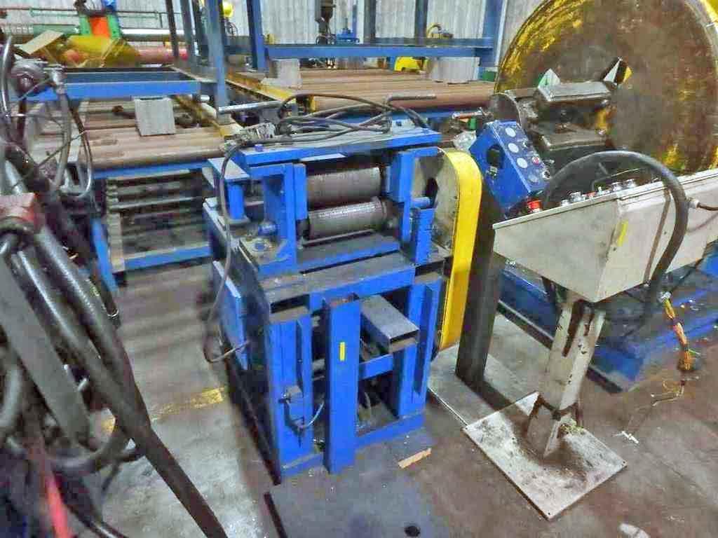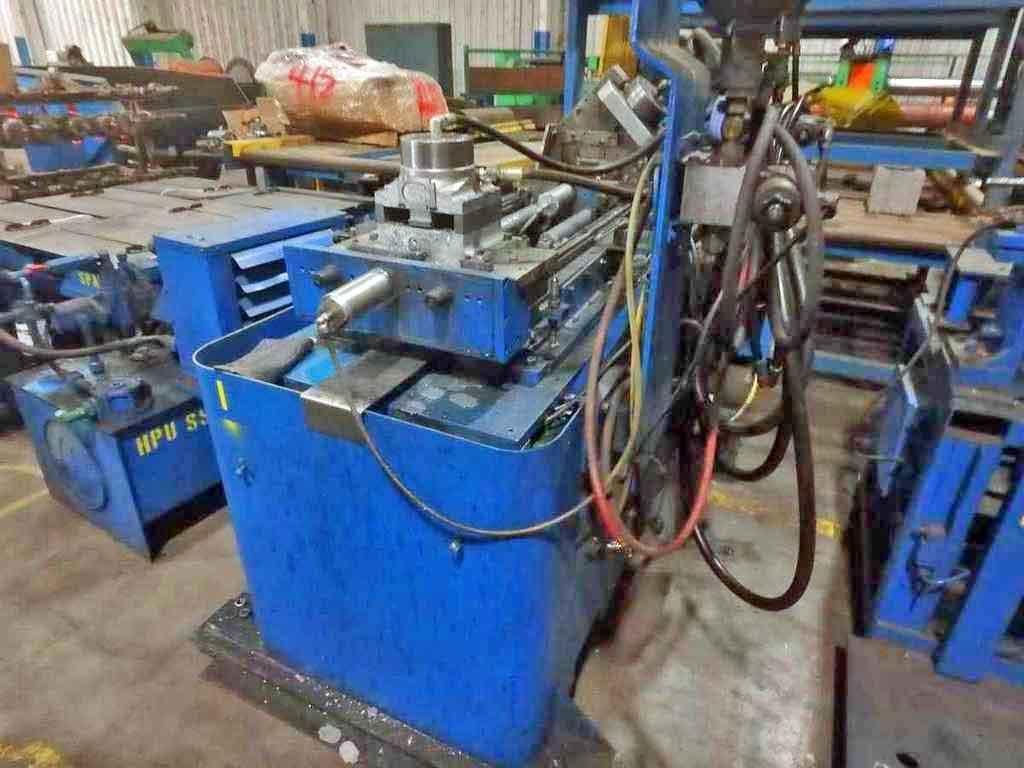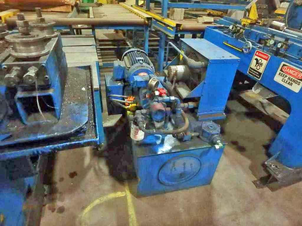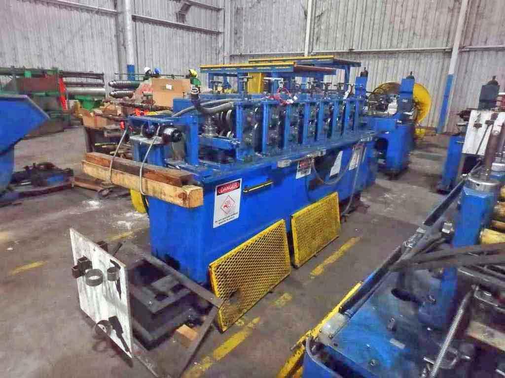 Rafter Rollforming Line -8 Stands -Roll Shaft Dia.: 1.50" -Roll Space: 8" -Tooling to make 1.25" Tall Legs for both Stud & Track -One width only - 3.625" -Material Thickness: Customer was running 20 - 25 Gauge (0.021" - 0.040") -150 FPM Max. Speed -Right to Left Operation Consisting of the following: -Uncoiler: Littel Double End 5,000# Capacity 68" Max. O.D. Electric Brake Manual Expansion -Rollformer: Rafter -Flying Post Punch/Cutoff: Hydraulic Operation with (1) Cutoff Insert to fit in 1 Dieset. -AMS XL200 Series Open Loop Length Controller: -Main Operators Panel: -Hydraulic Power Unit: