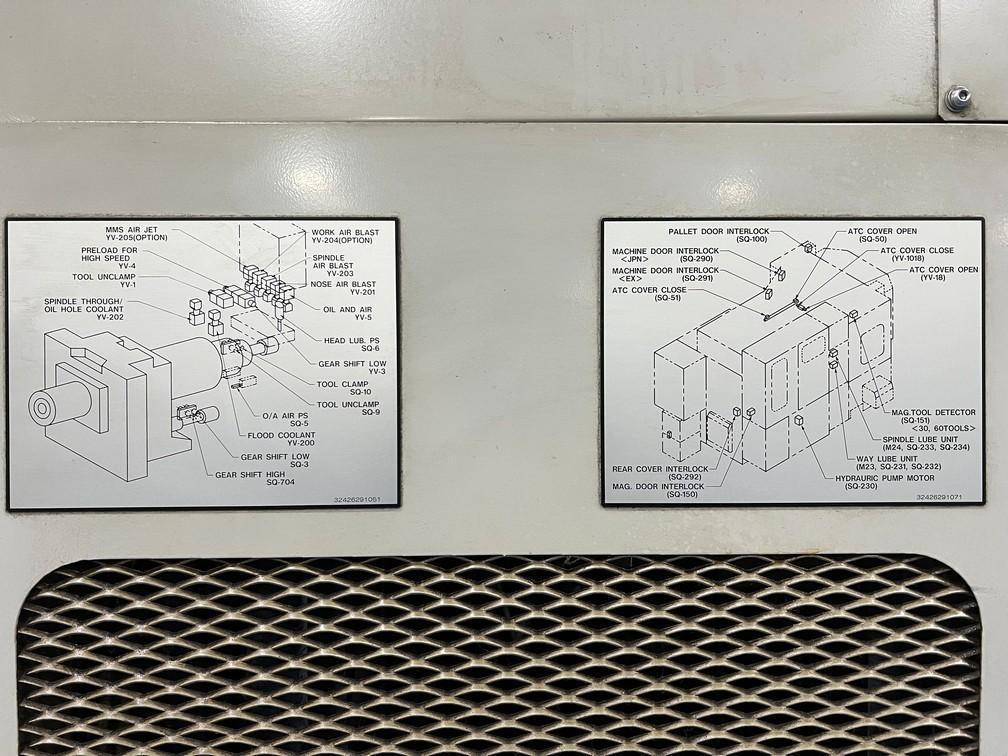 - X-axis 27.95" (710 mm) Rapid Traverse 1260 IPM (32000 MM/min) Cutting Feedrate .04-1260 IPM (1-32000 mm/min) - Y-axis 24.02" (610 mm) Same As X-axis - Z-axis 25.98" (660 mm) Same As X-axis - Center Spindle To Top Pallet 1.97-25.98" (50-660 mm) - Spindle Nose To Center Of Pallet 5.91-31.69" (150-810 mm) - Spindle Motor 30 HP - Spindle Nose ISO #40 - Spindle Speed 35-12000 RPM - Pallet Dimensions 19.69 x 19.69" (500 x 500 mm) - Max Pallet Load 500 LB - Max Dia. Tool Handled By ATC 5.91" (150 mm) - Machine Eight 23408 LB (10640 Kg) - Overall Dimensions 127.17" W x 158.54" D x 103.19" H (3230 x 4027 x 2621 mm)