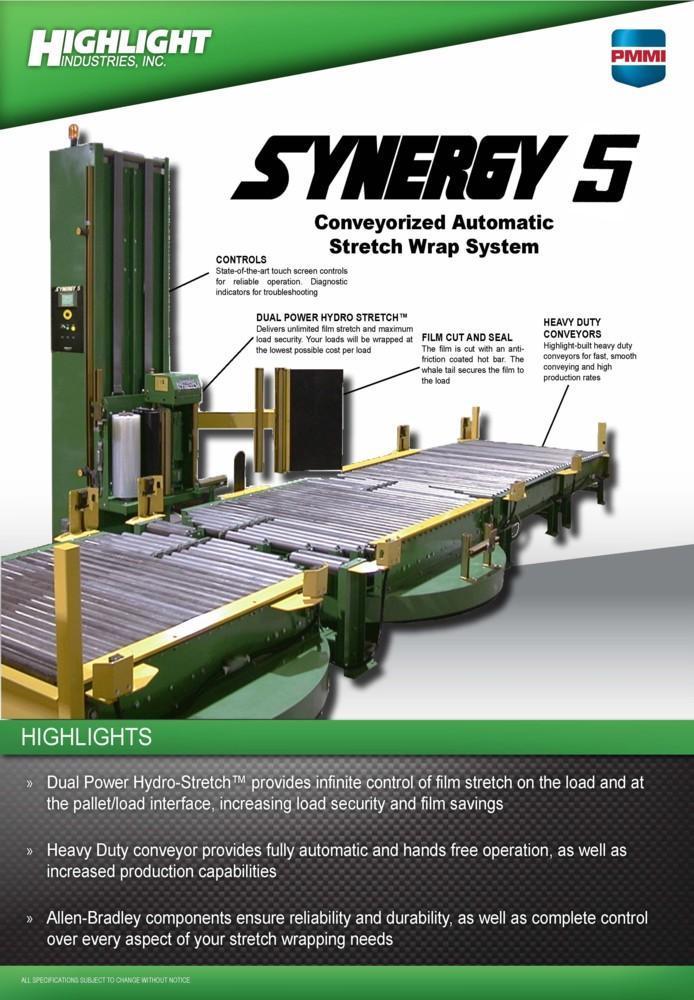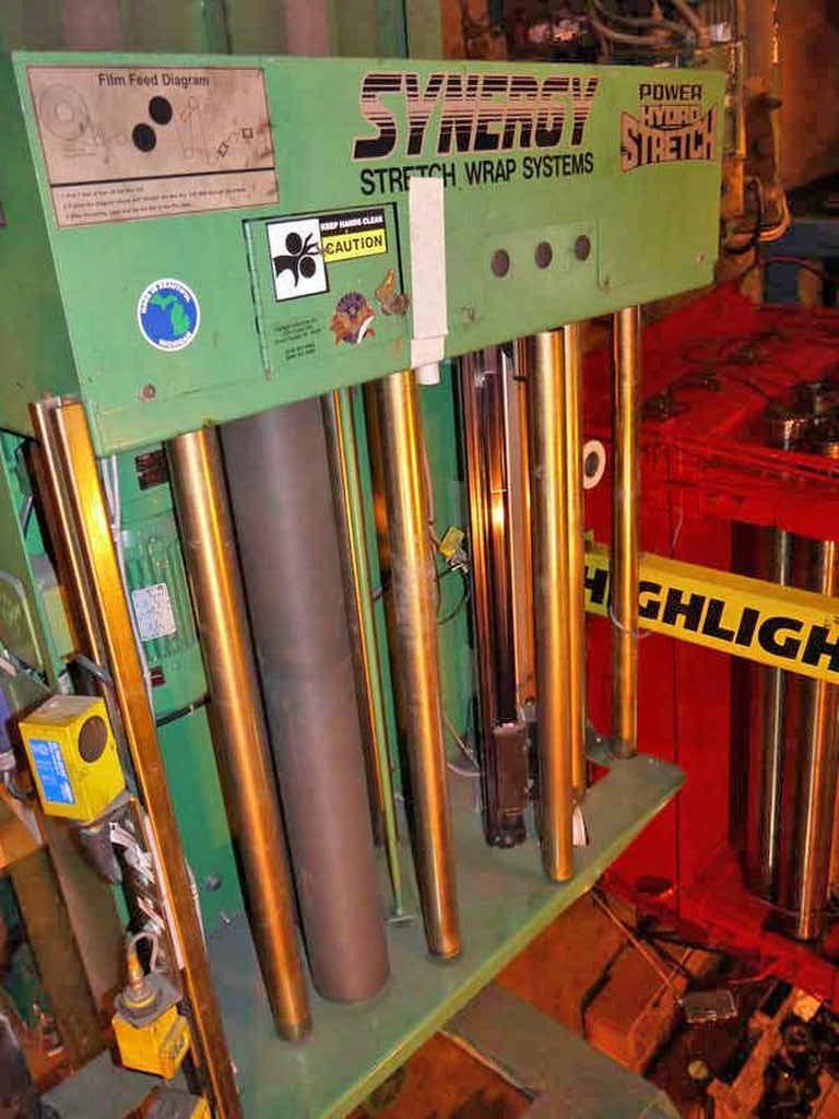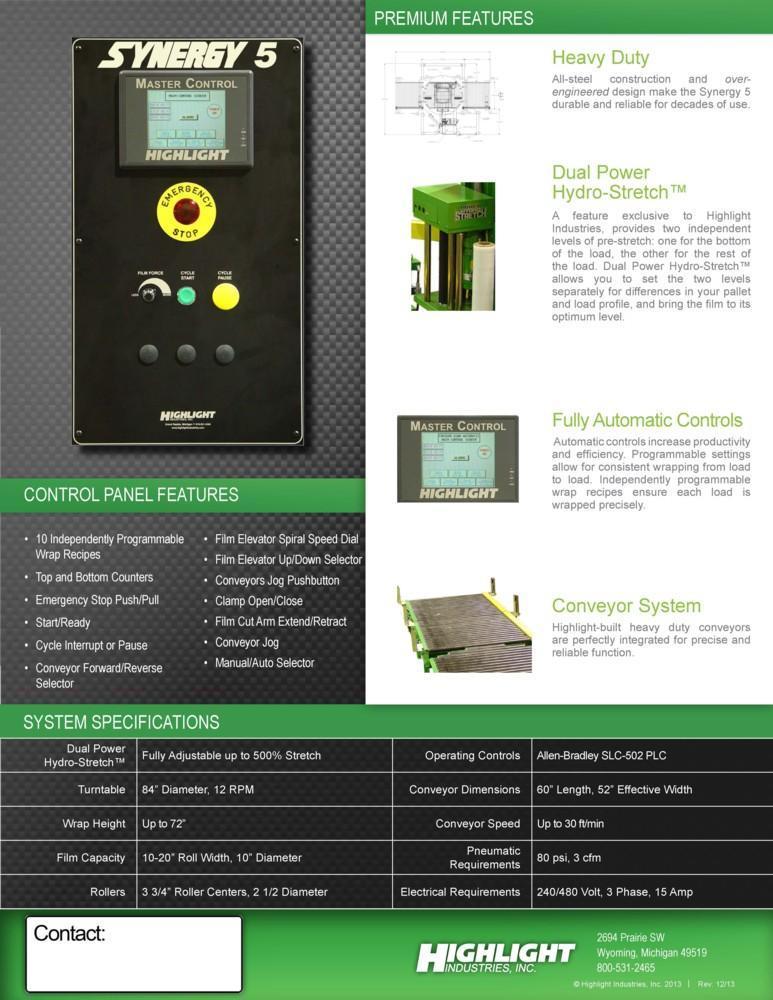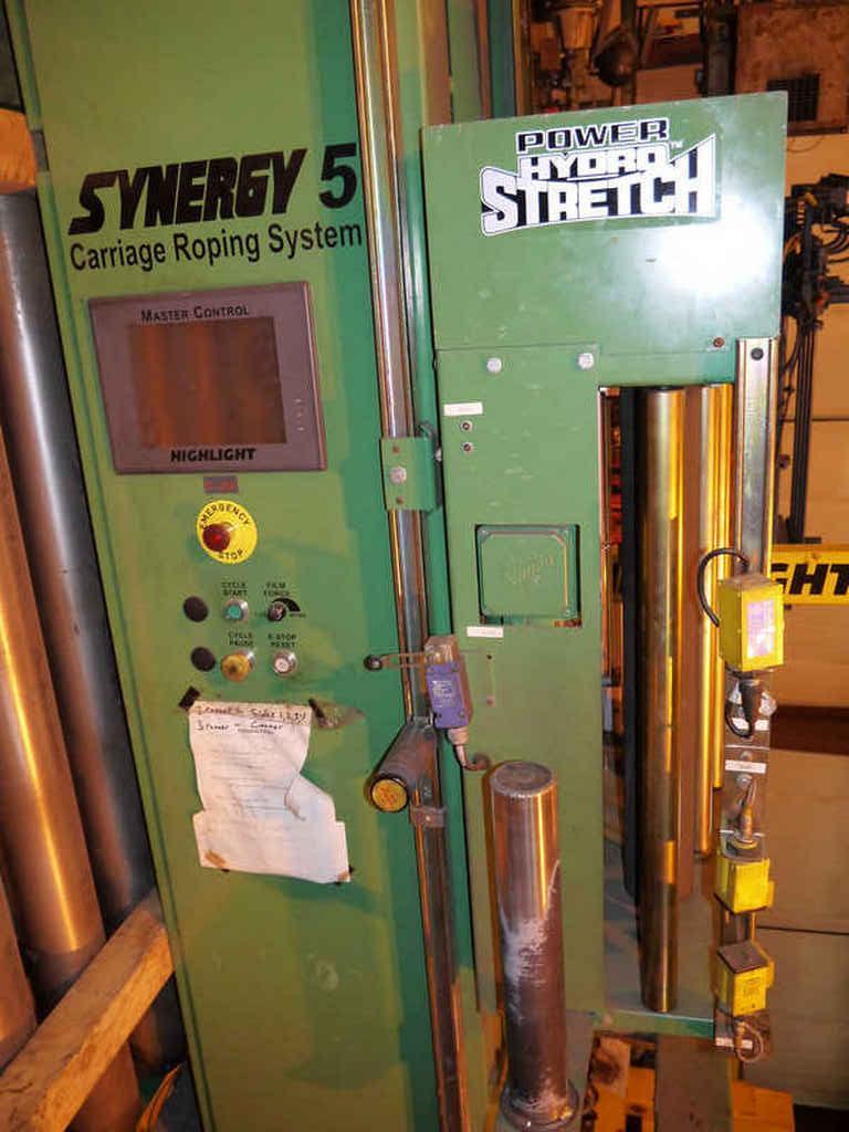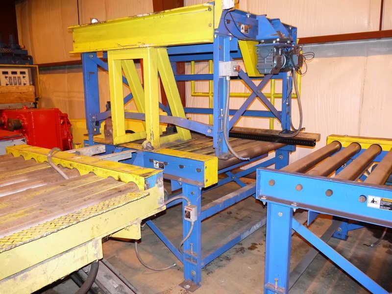 SES/Highlight Industries Coil Stretch Wrap Line Consisting of: -SES Motorized Conveyor Sections: (3) Sections 58" W x 63" Long with 4" Dia. Rolls Each Section individually powered by AC Gearmotor Photo Electric Limit Switches -Highlight Synergy 5 Stretch Wrapper: Power Hydro Stretch 65" Wide x 7' Long Powered Conveyor Conveyor also has powered rotation. 20,000# Coil Weight Capacity 3 HP AC Gearmotor for rotation Separate AC Motor for Conveyor Rolls 24" High Pass Line Height 6' Vertical PVC Roll Head Travel -Technical Description: Synergy 5 High Speed Roper Automatic Turntable Stretch Wrapper Model: MCJ-14013 Serial No.: G509-097-14013 Mfg.: Highlight Industries General System Information: Dual Power Hydro-Stretch, a feature exclusive to Highlight Industries, Inc. provides two independent levels of pre-stretch: one for the bottom of the product, the other for the rest of the product. Over 70% of film breaks occur at the bottom of the product where the product and pallet meet. Dual Power Hydro-Stretch allows you to set the pre-stretch level at the bottom of the product independent of the pre-stretch level on the rest of the product. This allows products to be wrapped tighter at higher stretch levels and at lower costs. Unlimited Film Stretch: Dual Power Hydro-Stretch has the ability to stretch any gauge or any quality of film to its ultimate stretch level. The stretch level of the Dual Power Hydro-Stretch is unlimited because it is not controlled by gears or pulleys. The flexibility of Dual Power Hydro-Stretch insures that whatever films are available today or tomorrow can be used to their maximum efficiency. Film Force Control: The film force applied to the product is also fully adjustable. Any force level, from a very light force to a very high force, can be applied to a product independent of the pre-stretch level. The pre-stretch level is maintained even when film force levels are decreased. Other older technology systems suffer from inelastic strain recovery, which relaxes or gives back 30% to 70% of the pre-stretch of the film when light force is applied to the product. This problem of relaxing does not occur with the Highlight Dual Power Hydro-Stretch. Dancer Bar System: The dancer bar system on the Dual Power Hydro-Stretch controls the force to the product and applies it evenly around the product. Other systems increase and decrease the speed of the power feed downstream roller to compensate for changes in film demand from the corners of the pallet. The changing of the speed of the film feed to compensate for the corners of the pallet increases and decreases the stretch level and is hard on the film, possibly causing the film and applies it smoothly to the product. This dancer bar system also provides a visual reference to monitor the force applied to the product. Turntable System: -3 HP 3 Phase AC Motor -AC Frequency Drive with Acceleration and Deceleration Control -12 RPM Turntable Maximum Speed -20,000 lb. Capacity Conveyor - 30 FPM Film Carriage / Elevator System: -1 HP AC Carriage Drive Motor -Top and Bottom Wrap Counters -Dual Belt Elevator Lift -Adjustable Raise and Lower Speeds -Automatic Height Detection Photoelectric Sensor -Adjustable Height Over-rides Film Delivery System: -Dual Powered Hydro-Stretch -.75 HP 3 Phase AC Motor -AC Frequency Drive with Acceleration and Deceleration Control -Adjustable Film Pre-Stretch -Adjustable Film Force -10" Diameter Roll Capacity -20" Height Roll Capacity -Roping capable Electrical Specifications: -Electrical Service: 480 VAC 3 Phase, 30 Amp, 60 Hz. -Air: 80 PSI, 3S CFM -Nema-12 rated, free standing control panel -Flexible conduit wire-ways -JIC wiring standard -Programmable Logic Controller Allen Bradley Micrologix 1400 -Industrial Nema-12 Push Button Operator Controls -Maple Systems HM1520T Touch Screen Operator Controls -Quick connect electrical connection Operators Manual/Electrical Drawings included. |